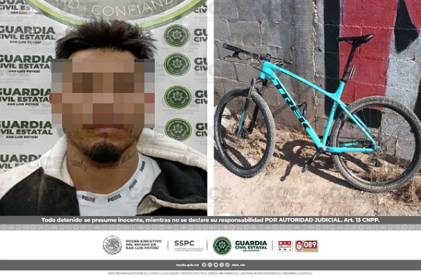 Cerro de San Pedro, S.L.P.- Una denuncia ciudadana atendida en la Línea de Emergencias 911, permitió la detención inmediata de una persona, por parte de agentes de la Guardia Civil Estatal; el presunto fue señalado del robo de una bicicleta de montaña.