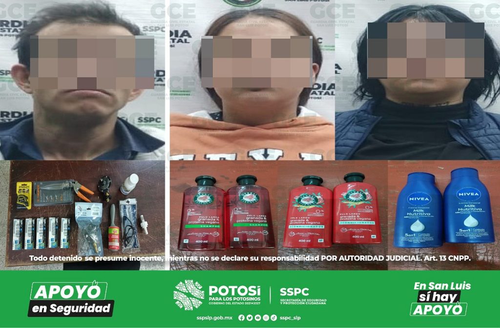 San Luis Potosí, S.L.P.- Mediante la coordinación inmediata entre el personal de los centros comerciales y la Guardia Civil Estatal (GCE), se logró la detención de un hombre y dos mujeres, presuntamente vinculados al robo a dos establecimientos comerciales.