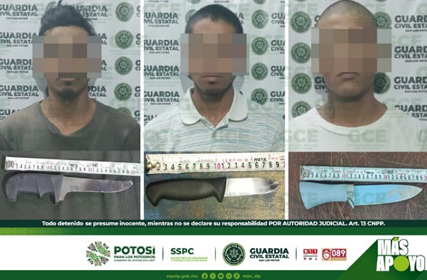 S.L.P.- Patrullajes preventivos efectuados por la Guardia Civil Estatal (GCE), derivaron en la detención de tres masculinos por el presunto delito de portación de armas prohibidas, con ello, se evitó que pudieran incurrir en actos que pusieran en peligro la integridad de la población.