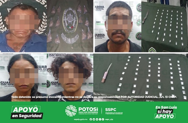 S.L.P.- Elementos de Guardia Civil Estatal (GCE) detuvieron a cuatro probables vendedores de droga; dos de ellos supuestos miembros de una célula delincuencial, quienes fueron ubicados gracias a los trabajos de inteligencia desarrollados tanto en la capital potosina como en el municipio de Axtla de Terrazas.