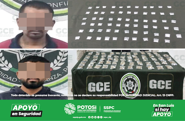 S.L.P.- Labores de análisis e inteligencia desarrolladas tanto en la capital potosina como en el municipio de Soledad de Graciano Sánchez, permitieron la detención de dos presuntos narcomenudistas y el aseguramiento de 112 dosis de droga.