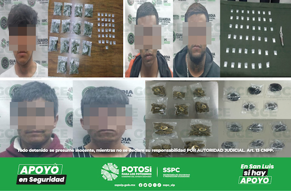S.L.P.- Como resultado de los operativos de seguridad, efectuados para inhibir actividades ilícitas como el narcomenudeo, elementos de la Guardia Civil Estatal (GCE) detuvieron a cuatro objetivos criminales, presuntos vendedores de narcóticos. Derivado de estas detenciones fueron aseguradas 113 dosis de estupefacientes.
