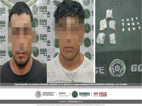 Santa María del Río, S.L.P.- En el marco de las acciones para inhibir la venta de narcóticos en el territorio potosino, efectivos de la Guardia Civil Estatal (GCE) detuvieron a dos hombres, por probable posesión de estupefacientes, con fines de venta.