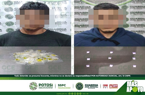 San Luis Potosí, S.L.P.- Acciones contundentes para el combate al narcomenudeo en todo el territorio potosino, derivaron en la captura de dos presuntos distribuidores de droga, en la capital potosina. Agentes de la Guardia Civil Estatal aseguraron 52 dosis de narcóticos, tras estos operativos.