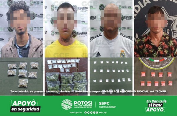 S.L.P.- Las acciones de inteligencia desarrolladas en las cuatro regiones del Estado, permitieron que oficiales de la Guardia Civil Estatal (GCE) detuvieran a cuatro presuntos integrantes de redes delictivas dedicados a la venta de narcóticos, tanto en la capital como en el municipio de Ciudad Valles. Derivado de su captura, a los masculinos se les aseguraron 62 dosis de droga.