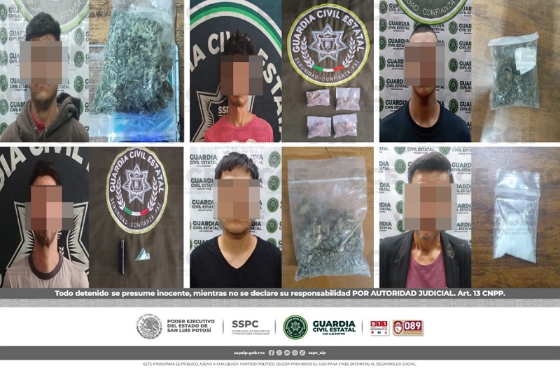 S.L.P.- Mediante los trabajos operativos de seguridad y vigilancia, efectuados por policías de la Guardia Civil Estatal (GCE), 12 personas quedaron detenidas por la probable posesión de dosis de enervantes.