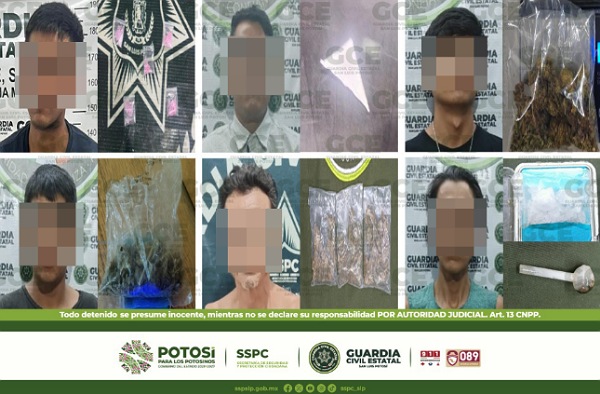 Al continuar con los dispositivos preventivos por parte de la Guardia Civil Estatal, se detuvo a Alejandro “N” de 44 años, por la presunta posesión de una bolsa con marihuana en la calle de Viveros, en la colonia Garita de Jalisco; en coordinación con la Policía Municipal dentro del operativo Cazador, se realiza la detención de Leonardo “N” de 27 años, por posesión de una dosis de “cristal” y una pipa en la avenida Valentín Amador de la colonia San Antonio del municipio de Soledad de Graciano Sánchez; José “N” de 20 años, fue detenido por la posesión de una bolsa de marihuana en la calle de Lago de Chalco, en la colonia San Luis Rey; en la calle de Vergel, del Barrio Vergel, se detuvo a Juan “N” de 38 años por la probable posesión de una dosis de “cristal”; Ronaldo “N” de 20 años, fue detenido por posesión de una bolsa de marihuana en la calle 99 y la calle 26 de la colonia Prados Segunda Sección; Enrique “N” de 49 años, fue detenido en probable posesión de tres bolsas de marihuana en las calles de Toltecas y Reforma, del Barrio Las Lomas, en el municipio de Ciudad Valles; Jorge “N” de 24 años, fue detenido por llevar tres bolsas de marihuana en la calle de Reforma de la colonia Cuauhtémoc, en el municipio de Ciudad Valles y Carlos “N” de 26 años, fue asegurado con cinco dosis de “cristal” en la calle de La Ventilla, de la colonia Gabriel Martínez en el municipio de Rioverde.