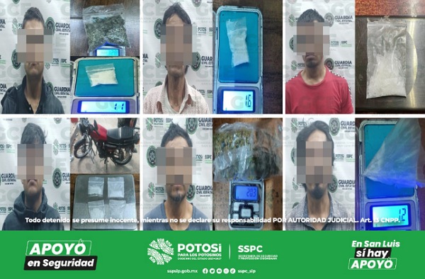 Al continuar con los dispositivos preventivos, se detuvo a Rosalio “N” de 38 años en las calles de Francisco I. Madero y José María Pino Suárez en la colonia Mártires de la Revolución con una dosis de “cristal”; en la colonia Satélite, se aseguró a Ricardo “N” de 47 años, por llevar consigo tres dosis de “cristal” sobre la calle de Privada de Simón Díaz; Argenis “N” de 28 años, fue detenido con una dosis de “cristal” en las calles de Pirules y Tulipán, de la colonia Tercera Chica; José “N” de 22 años, fue detenido con una bolsa de marihuana en las calles de República y Valentín Gómez Farías, en la zona centro del municipio de Villa de Arriaga; un joven de 16 años, fue asegurado por llevar consigo una dosis de “cristal” sobre las calles de Circuito Oriente y Circuito Sur, en la Unidad Habitacional Ponciano Arriaga, en el municipio de San Luis Potosí; José “N” de 21 años, fue apresado con una bolsa de marihuana en las calles de Hermanos Cerdán y Cuarta Privada de Ponciano Arriaga en la colonia El Mezquital; Arturo “N” de 21 años, fue apresado con una dosis de “cristal” en la zona centro de Ciudad Valles; los patrullajes estatales detuvieron a Abisaid “N” de 39 años por la presunta portación de dos dosis de marihuana en la colonia Vista Hermosa en el municipio de Ciudad Valles; José “N” de 20 años, fue asegurado con dos dosis de “cristal” y 15 artefactos metálicos conocidos como “ponchallantas” en el fraccionamiento Norte Residencial del mismo municipio y Geovani “N” de 21 años, fue asegurado por llevar consigo una bolsa de marihuana en el Barrio San Miguel del municipio de Tamazunchale.