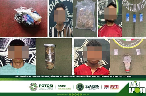 Mientras que la División Caminos de la GCE detuvo en el municipio de Villa Hidalgo, Juan “N” de 32 años de edad, fue asegurado con una dosis de marihuana y dos dosis de cocaína, así como una camioneta marca Chevrolet, tipo Equinox, en la que se desplazaba; Ricardo “N” de 23 años, fue detenido en el municipio de Ciudad Valles, con dos dosis de “cristal”; Oswaldo “N” de 27 años, quedó detenido en la colonia San Rafael, con dos dosis de “cristal”; Leonardo “N” de 24 años, fue sorprendido en la colonia Obrera con dos dosis de marihuana; así como Jorge “N” de 43 años, ubicado en el Ejido Calera, con una dosis de cocaína.