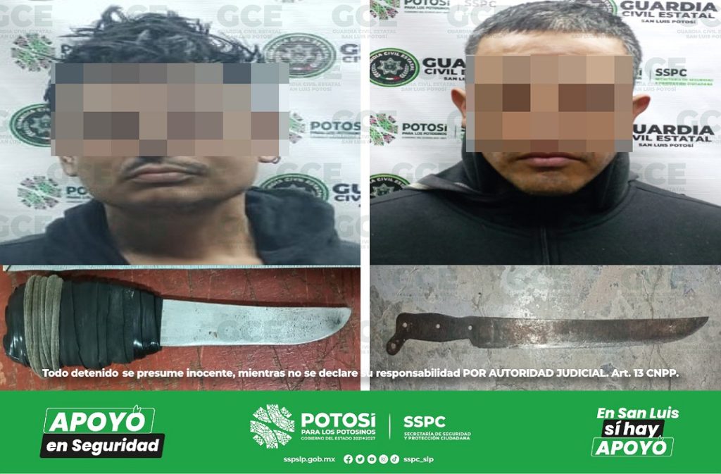 San Luis Potosí, S.L.P.- Derivado de los diferentes patrullajes de seguridad y vigilancia en la capital potosina, llevados a cabo por oficiales de la Guardia Civil Estatal (GCE), dos hombres resultaron detenidos por el probable delito de portación de armas punzocortantes.