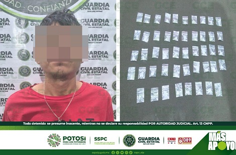 Efectivos de la GCE realizaban un dispositivo en este sector, logrando la captura de Jesús “N” de 32 años de edad, quien posiblemente esté vinculado a un grupo delictivo. Al momento de su arresto se le aseguraron 48 dosis de la droga sintética conocida como “cristal”, confeccionadas para su probable venta individual.