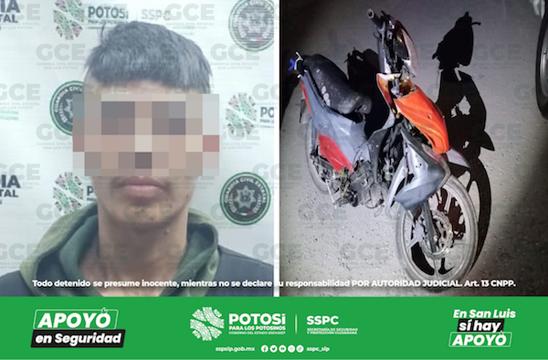 Por último, en el municipio de Soledad de Graciano Sánchez, policías de la GCE detuvieron a Fernando “N” de 24 años de edad, en la colonia Expropiación Petrolera, luego de asegurarle una motocicleta color gris con rojo y negro, sin placa, la cual tenía sus números de serie alterados.