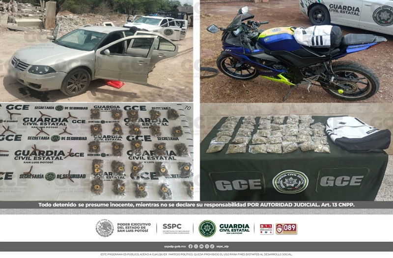 S.L.P.- Elementos de la Guardia Civil Estatal aseguraron dos vehículos, uno de ellos con reporte de robo en distintas acciones efectuadas en el municipio de Cárdenas y Tierra Nueva; llevaban paquetes con 65 dosis de marihuana y artefactos metálicos.
