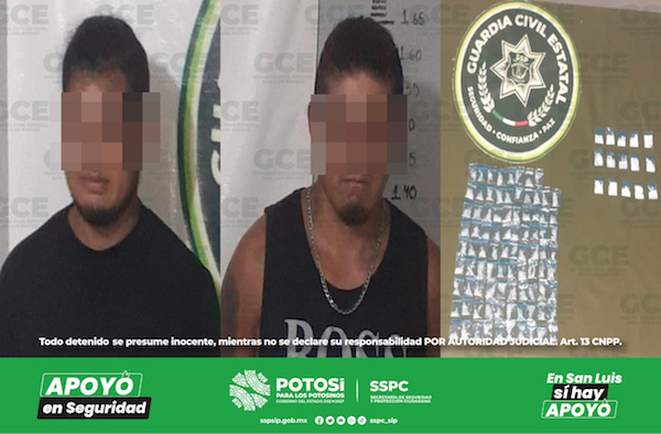 Tamazunchale, S.L.P.- Gracias a los trabajos coordinados entre la Guardia Civil Estatal (GCE) y mediante reportes de la ciudadanía, se logró la captura de dos supuestos vendedores de droga, a quienes se les aseguraron 103 dosis de narcóticos.