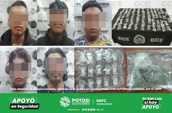 S.L.P.- Acciones de inteligencia desarrolladas por la Guardia Civil Estatal (GCE), tanto en la capital potosina como en el municipio de Ciudad Valles, permitieron la detención de ocho presuntos vendedores de droga; lo anterior resultó en el aseguramiento de 157 dosis de enervantes como parte del combate narcomenudeo.