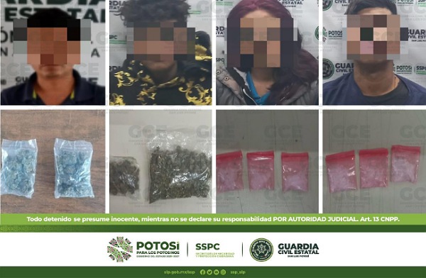 En la zona centro de la capital potosina, Jaime “N” de 57 años de edad, fue detenido con dos dosis de “cristal”; en este mismo sector, Francisco “N” de 23 años, fue asegurado con dos dosis de “cristal”; dentro de los operativos en la colonia Estrellas de Oriente, José “N” de 23 años, fue asegurado con dos dosis de “cristal” y una motocicleta; Christian “N” de 26 años, en la colonia Satélite, fue detenido con dos dosis de “cristal”; en recorridos sobre la colonia Wenceslao, Anita “N” de 22 años, Brayan “N” de 18 años y Francisco “N” de 20 años, fueron detenidos con seis dosis de “cristal” y dos de marihuana;