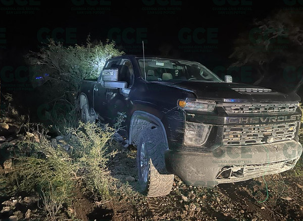 Por último, en el municipio de Charcas, durante los patrullajes emitidos en el Barrio Potrerillos, elementos de la GCE aseguraron una camioneta marca Chevrolet, modelo 2022, de doble cabina, mismo que contaba con reporte de robo del mes de junio del presente año, en la localidad Rancho Abajo.