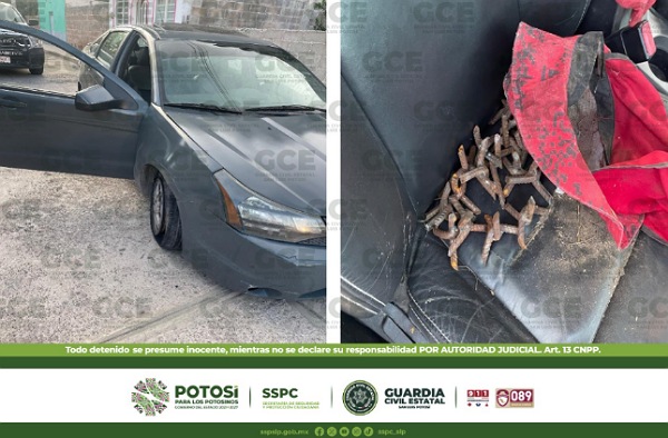 Charcas, S.L.P.- Labores operativas efectuadas en la región Altiplano, permitió que agentes de la Guardia Civil Estatal (GCE) aseguraran un vehículo y 19 artefactos de varilla, luego de una persecución que se presentara en el Barrio Chepinque.
