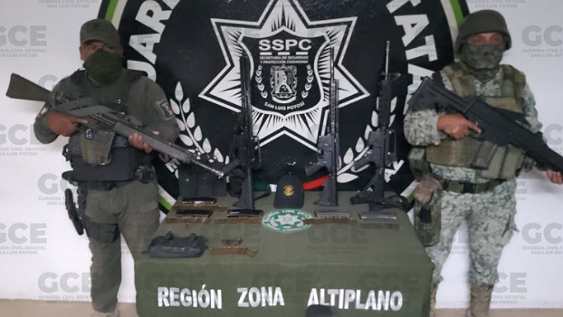 Matehuala, S.L.P.- Como resultado de los trabajos operativos de seguridad desarrollados por oficiales de Guardia Civil Estatal en coordinación con Ejército Mexicano, se aseguró una unidad en cuyo interior se descubrió armamento de grueso calibre, cargadores y cartuchos útiles, así como equipo táctico, procedente de una supuesta célula delictiva.