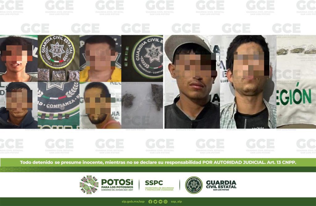 S.L.P.- Como resultado de las acciones implementadas en el Plan Integral de Seguridad, agentes de Guardia Civil Estatal aseguraron 62 dosis de enervantes y detuvieron a 22 personas en las últimas horas, entre ellas se encuentra una joven menor de edad; con ello las autoridades reafirman el compromiso con las familias potosinas y sus visitantes, de garantizar que la droga no llegue a infantes y jóvenes, principalmente.