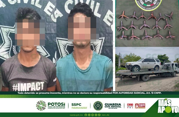 Ciudad Valles, S.L.P.- Agentes de la Guardia Civil Estatal (GCE), detuvieron a dos masculinos, por presuntos delitos contra la seguridad vial, en su modalidad de posesión de artefactos de varilla, denominados como “poncha llantas”.