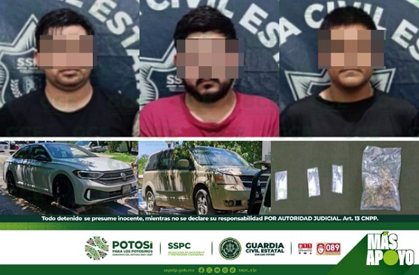Los presuntos fueron asegurados con tres dosis de cocaína; una bolsa con marihuana y dos vehículos sin reporte de robo, siendo uno Dodge, Panel, y otro Volkswagen, tipo Jetta, ambos con placas esta entidad federativa.