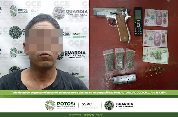 Al efectuar una inspección a su persona, se le aseguró un arma de fuego calibre 9 mm., un cargador abastecido con 9 cartuchos útiles, además de tres bolsas con marihuana. Cabe señalar que el detenido ya había sido remitido ante las autoridades en el mes de marzo del año en curso, por delitos contra la salud.
