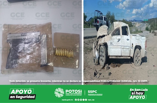 Ante estos hechos, el personal operativo de la GCE se aproximó a la unidad, mediante el protocolo de seguridad correspondiente, auxiliando a dos hombres y una mujer, posteriormente localizaron en su interior un arma de fuego calibre 9 milímetros y un cargador abastecido con 10 cartuchos útiles. Tras verificar el estatus de la unidad, resultó con reporte de robo del 09 de septiembre de 2023 del municipio de Venado.