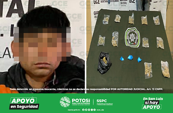 Al continuar con las acciones de seguridad, implementadas bajo el dispositivo Altiplano Seguro, mediante recorridos de seguridad y vigilancia, llevaron a cabo la detención de Arturo “N” de 21 años por la posesión de tres dosis de “cristal” y 12 bolsas con marihuana en calles del Barrio el Grasero, en el municipio de Charcas.