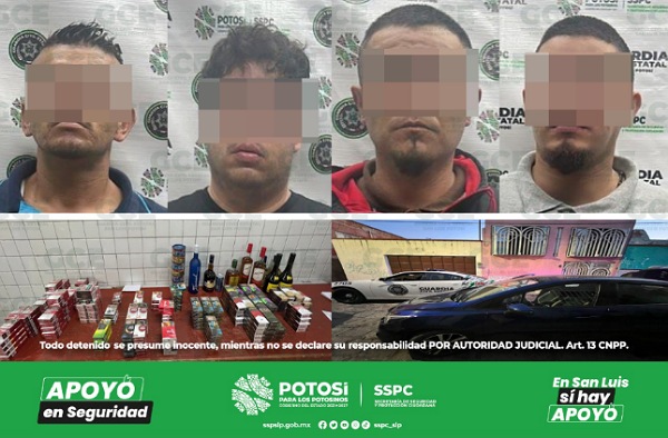 San Luis Potosí, S.L.P.- Como parte de la aplicación del Plan Integral de Seguridad en todo el territorio potosino, elementos de la Guardia Civil Estatal desarticularon una banda de presuntos delincuentes dedicados al robo a tiendas de conveniencia, derivado de los trabajos de inteligencia y mediante el seguimiento de las denuncias ciudadanas.