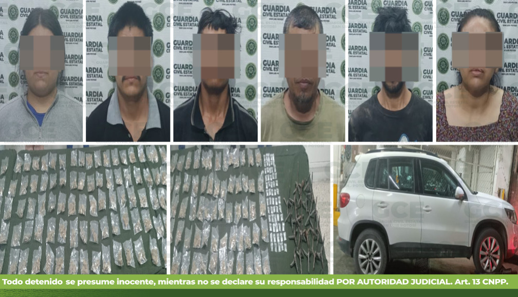 Villa Juárez, S.L.P.- Como parte del combate frontal a la delincuencia, la Guardia Civil Estatal (GCE), capturó a una presunta célula criminal que operaba en la región a quienes se les aseguró droga y armas prohibidas. Dos de los detenidos presuntamente están activos en la privación ilegal de la libertad y desaparición de personas.