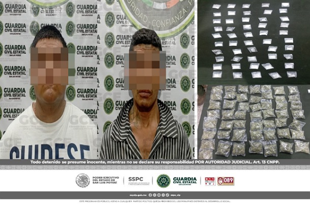 Juan “N” de 22 años de edad y Salvador “N” de 32 años, fueron sorprendidos con 562 gramos de marihuana, distribuidos en 50 bolsas plásticas, así como 50 dosis de la droga sintética conocida como “cristal”, esto derivó al desmantelamiento de dicho espacio y a la detención de dos objetivos criminales prioritarios, debilitando uno de los lugares que la delincuencia utiliza para la venta de enervantes.