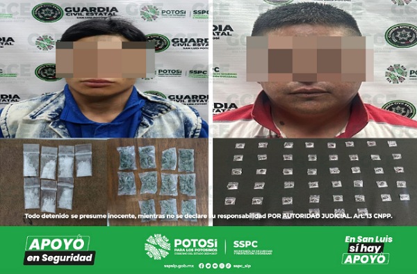 S.L.P.- Dentro de las acciones dispuestas para inhibir delitos como el narcomenudeo, oficiales de la Guardia Civil Estatal (GCE) desmantelaron un probable “punto” de venta de droga, además se detuvo en diferentes hechos a dos supuestos narcomenudistas.