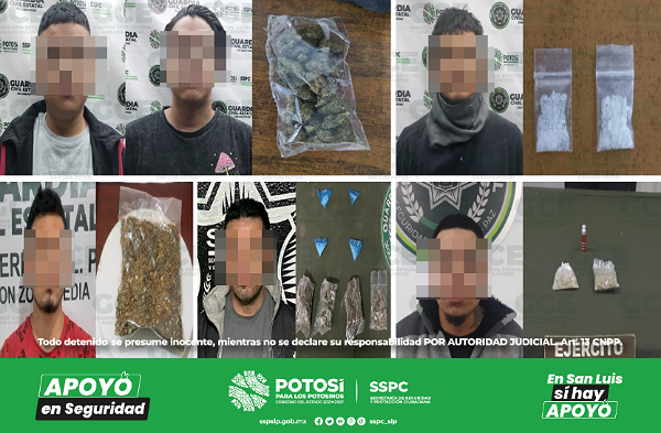 Ocho personas resultaron detenidas en la capital potosina: el primer hecho tuvo lugar en la colonia Los Salazares, José “N” de 32 años fue asegurado con una dosis de marihuana y un vehículo en el que viajaba; sobre la colonia San Ángel, Marco “N” de 25 años, fue detenido con una dosis de “cristal”; en la delegación La Pila, Jesús “N” de 43 años, quedó detenido con una dosis de “cristal”;