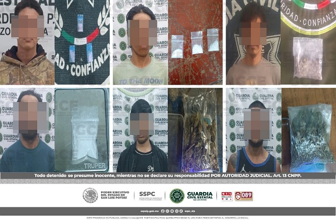 S.L.P.- Derivado de los operativos de seguridad, efectuados por elementos de la Guardia Civil Estatal (GCE) para inhibir el consumo de drogas y su comercialización, 13 personas fueron detenidas, en diferentes puntos de la entidad, por probable posesión de droga.