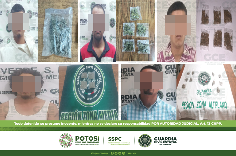 Al interior del estado, se logró asegurar en el municipio de Cárdenas a Francisco “N” de 19 años por llevar seis bolsas de marihuana; en el municipio de Rioverde, de aseguro a José “N” de 37 años por presunta posesión de cuatro bolsas con marihuana y finalmente, en el municipio de Matehuala, se apresó a Mario “N” de 28 años con 10 bolsas de marihuana.