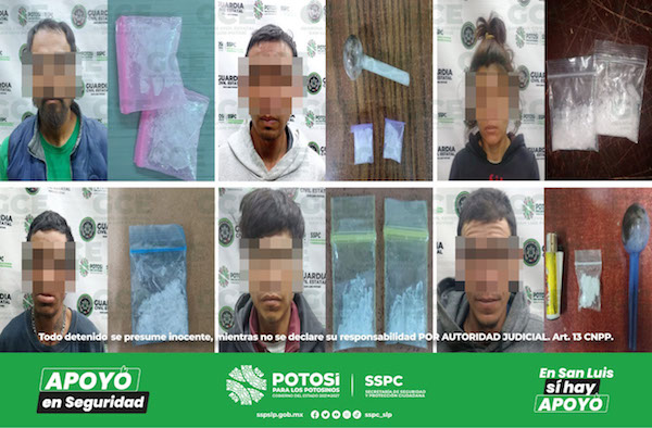 Gracias a los trabajos realizados por las fuerzas del orden, se logró el aseguramiento de ocho personas en distintos hechos en la zona metropolitana de la capital potosina, los cuales llevaban consigo varias dosis de estupefacientes.