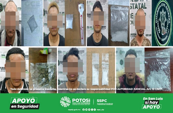 En el municipio de Ciudad Valles, Aureliano “N” de 22 años de edad, fue detenido con dos dosis de “cristal”, en la colonia Las Lomas; por su parte, en el municipio de Cerritos, en la localidad de Tepozán, Jair “N” de 21 años, fue detenido con una dosis de “cristal”; por su parte, en la colonia Del Sol, en el municipio de Rioverde, Isaías “N” de 29 años, fue asegurado con una dosis de marihuana; en el Ejido Puente del Carmen, Moisés “N” de 30 años, quedó detenido con una bolsa que contenía marihuana. Por último, en el municipio de Matehuala, Francisco “N” de 25 años de edad, fue detenido con tres dosis de “cristal”.