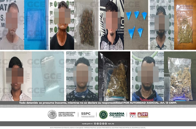 S.L.P.- En diferentes acciones operativas, oficiales de la Guardia Civil Estatal (GCE) detuvieron a 15 personas por presuntos delitos contra la salud, en su modalidad de posesión de estupefacientes.