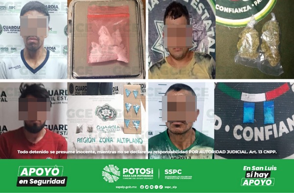 Otro de los hechos tuvo lugar en el municipio de Tamazunchale, elementos de la GCE arrestaron a Arán “N” de 37 años de edad, con dos bolsas que tenían marihuana; durante los patrullajes emitidos en el municipio de Rioverde, en el Ejido San Marcos, José “N” de 43 años fue sorprendido con dos dosis de “cristal”; por su parte, oficiales de la GCE detuvieron a Edgar “N” de 33 años en la colonia Manuel Moreno Torres, perteneciente al municipio de Matehuala, después de asegurarle dos dosis de marihuana y 6 de “cristal”.
