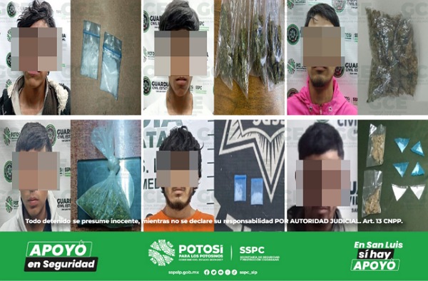 Un menor de 15 años fue ubicado en la colonia Torres Bodet con una bolsa que contenía marihuana; en la colonia Ponciano Arriaga, Alejandro “N” de 33 años fue detenido con una dosis de marihuana; policías de la GCE detuvieron a José “N” de 27 años con dos dosis de “cristal” en la colonia María Cecilia Tercera Sección; sobre la colonia Valle del Potosí, a Irving “N” de 19 años le aseguraron cuatro bolsas con marihuana; sobre la colonia Las Trancas a Ángel “N” de 18 años se le aseguró una bolsa con marihuana; sobre la delegación La Pila, a Víctor “N” de 51 años lo sorprendieron con una dosis de marihuana;