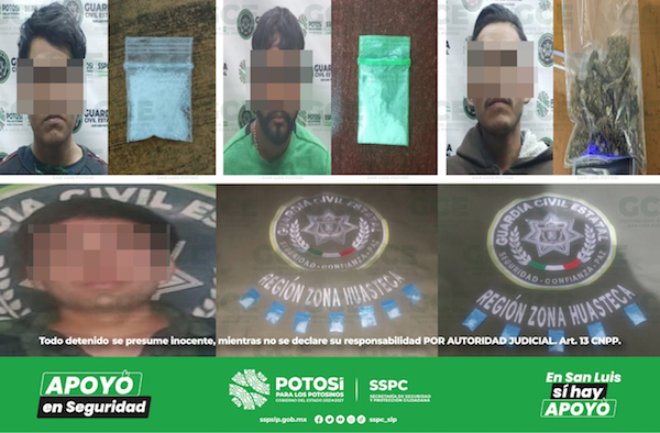 A su vez, en el municipio de Soledad de Graciano Sánchez, sobre la colonia 21 de Marzo, un joven de 17 años fue asegurado con una dosis de marihuana; también en el municipio de Villa Hidalgo se detuvo a Braulio “N” de 35 años de edad, con una dosis de “cristal”; otro de los hechos fue en el municipio de Axtla de Terrazas, sobre el Barrio San Miguel, ahí fue detenido Elios “N” de 20 años y un menor de 14 años con 12 dosis de “cristal”.