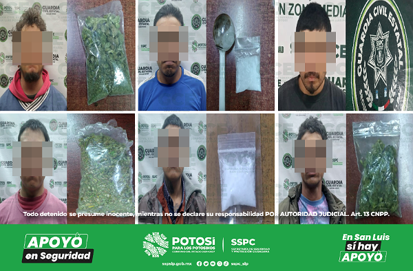A su vez, en el municipio de Soledad de Graciano Sánchez, efectivos de la GCE detuvieron a José “N” de 35 años de edad, en la colonia Expropiación Petrolera, al asegurarle dos dosis de cocaína y tres de “cristal”; por su parte, en el municipio de Ciudad Valles, Jesús “N” de 30 años, fue detenido con cuatro bolsas que contenían marihuana, durante los operativos en la colonia Lázaro Cárdenas; por su parte, en el municipio de Rioverde, José “N” de 38 años, fue asegurado con dos dosis de “cristal”; por último, en el municipio de Matehuala, en la colonia Las Golondrinas, Tomás “N” de 38 años, fue asegurado con una dosis de marihuana.