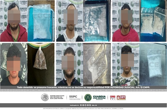 S.L.P.- En distintas acciones y como parte de la aplicación del Plan Integral de Seguridad en todo el territorio potosino, elementos de la Guardia Civil Estatal detuvieron a 19 personas por la presunta posesión de droga.