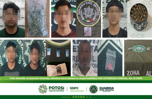 S.L.P.- Derivado de los patrullajes de seguridad y vigilancia, implementados en la capital potosina y en el interior del estado, oficiales de la Guardia Civil Estatal (GCE), detuvieron a 20 personas, luego de asegurarles dosis de enervantes que presumiblemente llevaban entre sus pertenencias.