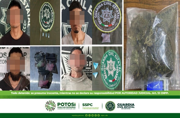 Durante los recorridos de la Guardia Civil Estatal, se detuvo a Alejandro “N” de 53 años con una dosis de “cristal” cuando deambulaba en las calles de República de El Salvador y calle República Dominicana, en la colonia San Francisco, del municipio de Soledad de Graciano Sánchez; Edwin “N” de 22 años, fue detenido con tres dosis de “cristal” en camino a la localidad de Palictla, de la colonia San Rafael, en el municipio de Tamazunchale; En las calles de Bocanegra y Francisco I. Madero, de la colonia Vista Hermosa del municipio de Ciudad Valles, se aseguró a José “N” de 32 años con una bolsa de marihuana; en el municipio de Villa Juárez, se aseguró a Juan “N” de 18 años por llevar consigo tres dosis de “cristal” en el Barrio de San Rafael y en la calle de Reforma, de la zona centro del municipio de Matehuala, se aseguró a Fernando “N” de 38 años, con dos dosis de “cristal”.