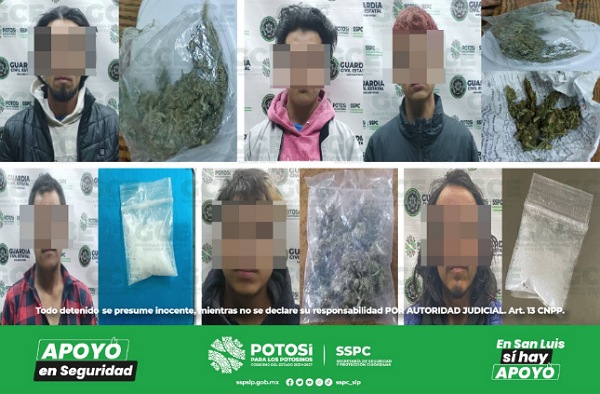 El primer hecho fue en la colonia Bellas Lomas, Cristian “N” de 22 años de edad, fue detenido con una dosis de “cristal”; sobre la colonia Hacienda de Gogorrón, Esteban “N” de 45 años de edad, fue detenido con una dosis de “cristal”; Carlos “N” de 22 años, también fue asegurado con una dosis de “cristal”, en la colonia La Hacienda; por su parte, en la colonia Bellas Lomas, José “N” de 24 años y Erik “N” de 21 años, quedaron detenidos al asegurarles una dosis de marihuana y una de “cristal”; por su parte, en la colonia Valle del Campestre, Christian “N” de 30 años, fue asegurado con una dosis de marihuana.
