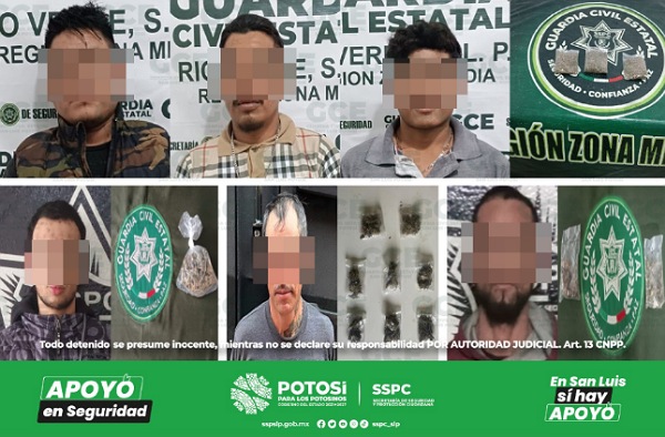 En la colonia Mirasol, en el municipio de Tamuín, Adrián “N” de 27 años de edad, fue detenido con tres dosis de “cristal”; Osmar “N” de 18 años, fue asegurado con cuatro bolsas con marihuana, en la zona centro de El Naranjo; Mario “N” de 20 años, fue ubicado en el municipio de Axtla de Terrazas, con una dosis de marihuana; otro de los sucesos ocurrió en el municipio de Tanquián de Escobedo, José “N” de 24 años fue detenido con dos dosis de marihuana; en el municipio de Ciudad Valles, Francisco “N” de 23 años, fue capturado con dos dosis de “cristal”; en el municipio de Tamazunchale, elementos de la GCE aseguraron en la colonia Los Naranjos, una motocicleta con una mochila, dentro de la cual había nueve dosis de “cristal”.