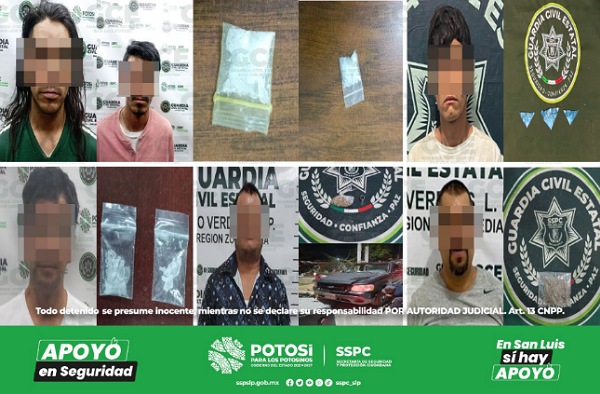 El firme combate al narcomenudeo en los 58 municipios del estado, dio como resultado la detención Ismael “N” de 29 años por llevar consigo una dosis de marihuana en Plaza del Cóndor de la colonia Prados 2da Sección; en la Cuarta Privada de Popocatépetl y Av. Popocatépetl en la colonia María Cecilia, se aseguró a Osvaldo “N” de 22 años por posesión de una dosis de marihuana; Julio “N” de 20 años, fue detenido por llevar consigo tres dosis de marihuana en las calles de Periódico Oficial y Periódicos Potosinos de la colonia Morales; Jaime “N” de 57 años, fue asegurado con una dosis de “cristal” en la avenida Eje Vial del Barrio de Tlaxcala; en la calle de Socorro Blanco, en la colonia Estrellas del Oriente, se detuvo a Luis “N” de 29 años con presuntamente llevar consigo una dosis de marihuana; Cristian “N” de 22 años, fue detenido por posesión de una bolsa de marihuana en la calle de Nevado de Toluca y avenida Popocatépetl, en la colonia María Cecilia; Juan “N” de 47 años, fue asegurado por llevar consigo una dosis de “cristal” en las calles 93 y 40 en la colonia Pardos de San Vicente; Hilario “N” de 49 años, fue asegurado con una dosis de “cristal” en las calles de Oro y López Hermosa en la colonia Morales; Mauricio “N” de 19 años, fue asegurado en la calle de Prolongación Xicoténcatl en la colonia Tierra Blanca, por presuntamente llevar consigo una dosis de marihuana.
