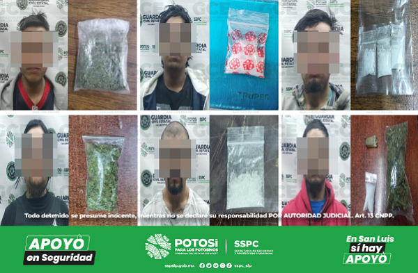 Por su parte, en el municipio de Rioverde, en la localidad de San Francisco de Asís, Pedro “N” de 37 años y Pedro Antonio “N” de 32 años, quedaron detenidos luego de asegurarles tres dosis de “cristal” y un vehículo marca Ford, en el que se desplazaban; a su vez, en el Barrio Primero El Refugio, en el municipio de Ciudad Fernández, Iván “N” de 28 años, fue detenido con tres dosis de “cristal”; por último, en el municipio de El Naranjo, San Juana “N” de 26 años, quedó detenida luego de asegurarle tres dosis de “cristal”.